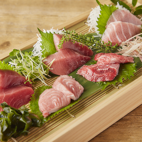 大トロ・中トロ・赤身・希少部位2種が盛り合わさった"トラエモンセット"は様々なマグロが楽しめます。