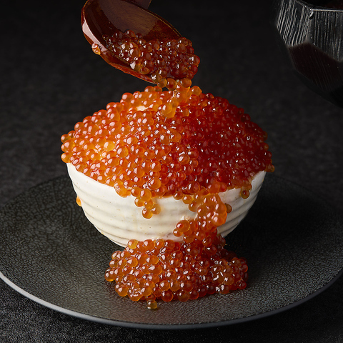 新鮮ないくら飯をお客様の目の前でこぼれるまでかけ続けます!もちろん生産者様が大切に育ててくれた食材なので召し上がれる範囲でお願いしています。炊き立てのご飯にいくらをたっぷりこぼれるまで!/