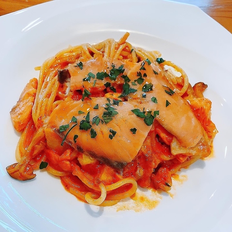 【季節のパスタ】スモークサーモンと3種のきのこを使用したトマトクリームパスタ