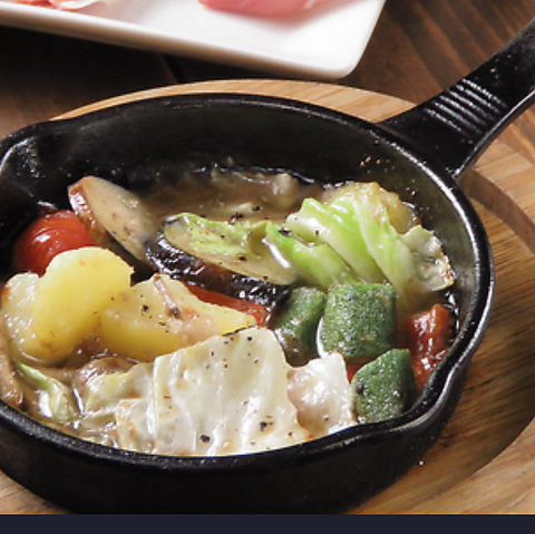 大人気!自家製スパイス餃子 特製ガラムマサラを加えたスパイシー餃子!1個130円燻したジャガイモとたくあんで作った特製ポテトサラダに、バーニャカウダorエスニックなナンプラーソースのアヒージョや、スパニッシュチーズオムレツ、鶏の唐揚げ1個はナンプラー風味で花山椒がアクセント!