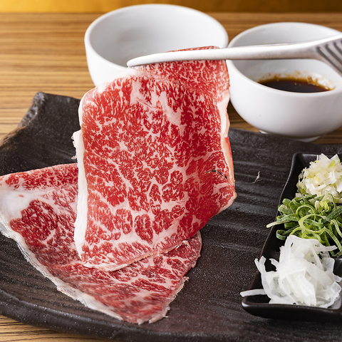厳選黒毛和牛を贅沢に“焼きしゃぶ”スタイルでご提供!薬味は「白ねぎ」「青ねぎ」「玉ねぎ」の3種、タレは「特製ユッケダレ」「ポン酢」からお選びいただけます。焼肉としゃぶしゃぶの良さを兼ね備え、しっとりジューシーで後味さっぱり!数量限定につき、ご注文はお早めに。※日によって提供数が異なります。
