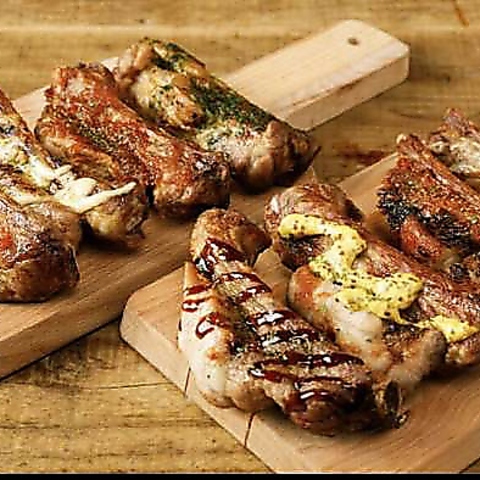 看板メニュー「スペアリブ」は、じっくりと焼き上げた柔らかな肉質が自慢です♪ 選べる8種類のソースから、あなたのお好みの味をお楽しみいただけます!特におすすめは、スタンダードな甘辛BBQソースが一押し !お肉との相性が抜群で、一度食べたらやみつきに!すべてのソースが食べれる全種盛り合わせは圧巻!