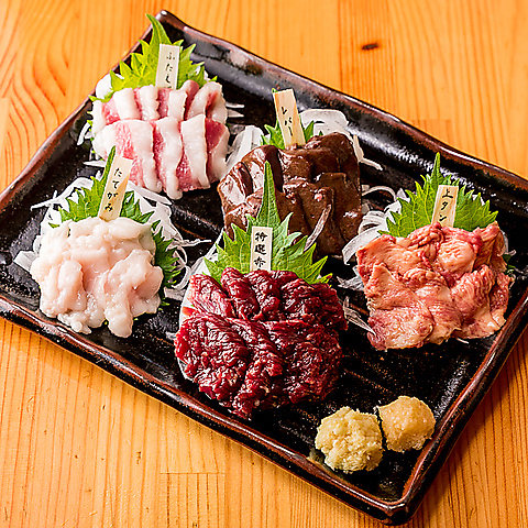 当店オーダー人気ナンバーワン!!純国産、熊本直送の肉本来の赤身の旨みと“もっちり”とした食感が楽しめる名物馬刺しはオーダー必須!上赤身、中トロなどそれぞれの部位の旨み、希少部位、グループならお得な盛合せがオススメ♪