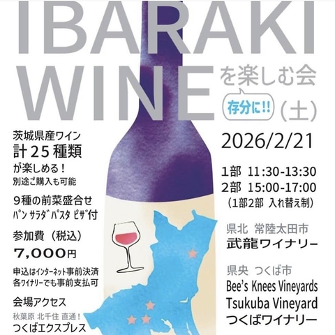 2月21日(土)茨城県産ワインを存分に楽しめるイベントを開催!県内ワイナリーのワイン全25種類を飲み比べ。9種の前菜盛り合わせに、パン・パスタ・ピザ付き!