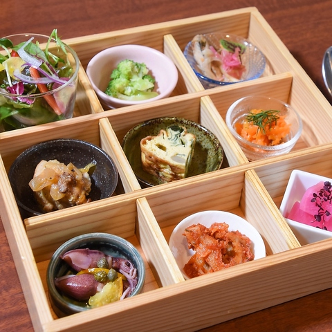 木箱に入った前菜9種/スープバー/パン(おかわり自由)/お好きなパスタorメイン/ドルチェ/ドリンクバーがついたスペシャルランチコース※12/2-12/25はランチコースをXmasランチコースに変更してご提供します。