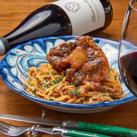 牛テールの豪快な煮込みを生パスタで!!ローマを代表する煮込み料理/牛テールをトロットロになるまで煮込んだコラーゲンたっぷりの濃厚赤ワイン煮込みです。