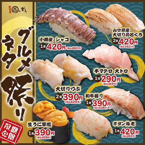 | 料金備考 | 毎月変わる期間限定旬のネタをご用意!食べ放題メニューも有! |