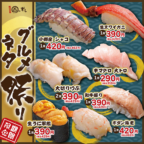 | 料金備考 | 毎月変わる期間限定旬のネタをご用意!食べ放題メニューも有! |