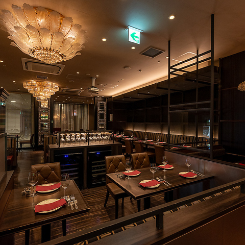 天井に輝くシャンデリアが店内を華やかに彩り、まるで高級クラブにいるかのような上質な雰囲気を演出します。大切な方との記念日や接待、少し贅沢なディナーにも最適で、非日常感を味わえる特別な空間です。柔らかな光に包まれた店内は、写真映えも抜群で思い出に残る時間をお過ごしいただけます。