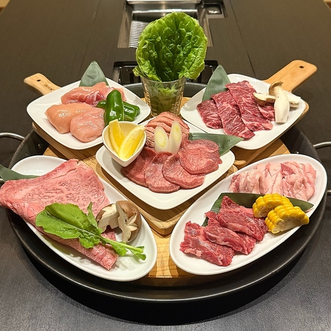 和牛上ロース・牛ハラミ・厚切り牛タン・下田豚カルビ鶏肉などとにかくお肉がいっぱいの盛り合わせ※約2から3人前でボリューム満点!!見ても食べても美味しい!人気NO,1!これを食べられて追加のお肉を頼まれる方が多いです悩んだらコレを頼めば間違いなしです!