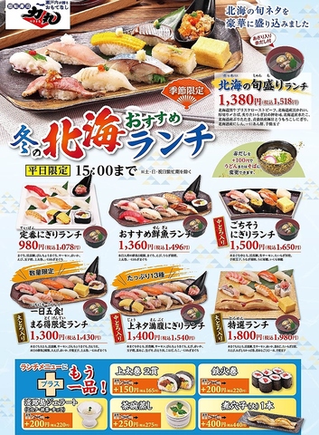 平日11~15時限定!!【1】北海の旬盛りランチ1518円(込)【2】定番にぎりランチ1078円(込)【3】おすすめ鮮魚ランチ1496円(込)【4】ごちそうにぎりランチ1650円(込)【5】一日五食!まる得限定ランチ1430円(込)【6】上ネタ満腹握りランチ1540円(込)【7】特選ランチ1980円(込)