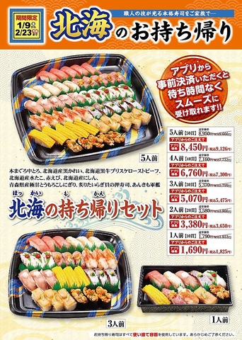 “北海のお持ち帰りセット”アプリご注文価格1人前1825円(税込)~5人前9126(税込)本まぐろ中とろ・北海道産黒かれい・北海道黒牛ブリスケローストビーフ・北海道産水たこ・赤えび・北海道産にしん・青森県産極甘とうもろこしにぎり・炙りたいらぎ貝の押寿司・あんきも軍艦