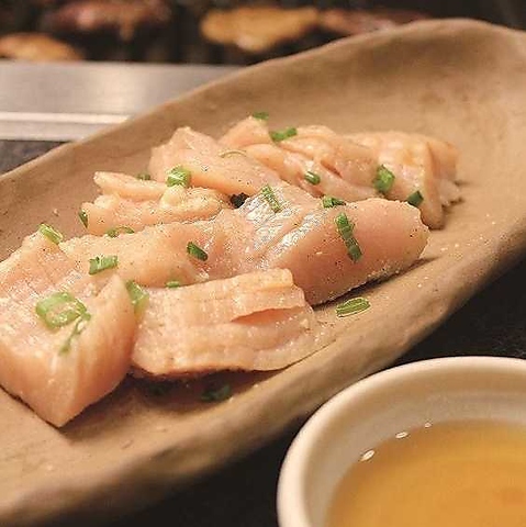 牛長オリジナルメニュー『キューブ』。牛の中落ちを使用している、旨味がつまったお肉です。お希少部位のため数量に限りがございますが、牛長に来たらぜひ食べていただきたい逸品です。塩をつけてお召し上がりください。