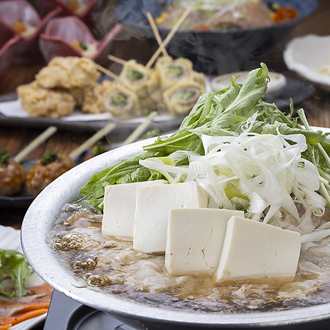 お造り3種盛り合わせ、鮟鱇唐揚げ、肉巻き野菜串の天ぷら、国産牛もつ鍋、鍋後讃岐うどんなど旬素材をふんだんに使用した料理が全8品の豪華なコースです。+300円(税込)で地酒や焼酎も飲み放題の特選飲み放題にグレードアップできます♪