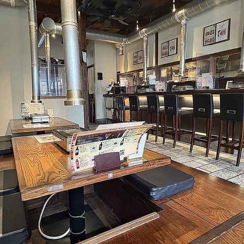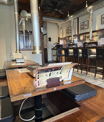 【掘りごたつの御座敷席】足を伸ばしてゆっくりお寛ぎ頂ける掘りごたつのお席をご用意しております。ファミリー様やグループでのご利用にぴったりです。小さいお子様向けのメニューもご用意しておりますのでお子様連れのお客様も安心してご来店頂けます。