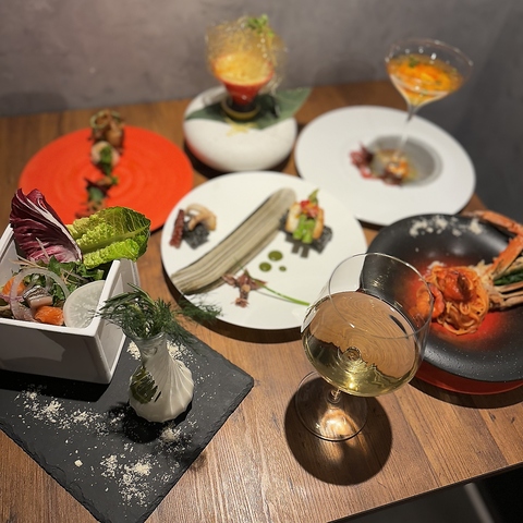 地元・森田農園直送の野菜をたっぷり使ったサラダで始まる贅沢なコース。鮮魚のカルパッチョは港から届いたばかりの鮮度でご提供し、海鮮料理は当日の仕入れに応じたスペシャルな内容に。選べるパスタは五種から、メインには厳選和牛のローストを本日のソースで華やかに。最後はお楽しみ、本日のデザートで締めくくります。特別な日にふさわしい、満足度の高いコースです。