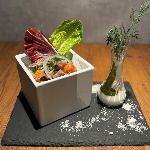 旬と地元食材をふんだんに使った、五感で味わう物語仕立てのコース。前菜5種盛りから始まり、柏産野菜のサラダ、港直送の鮮魚カルパッチョ、選べるPIZZAまたはパスタ、メインのキンソウ鶏ソテーまで、すべてが丁寧な手仕事と素材への想いに満ちた一皿です。自慢の料理とお酒を心ゆくまでお楽しみください。