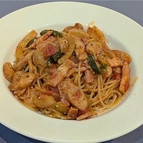 大きめの海老がプリプリとして美味しいパスタです!!トマトソースには濃厚クリームをふんだんに使い、トマトの酸味とクリームのまろやかさがバランスよくお互いを引き立てています♪太めのパスタを使っているのでソースが良く絡む!!
