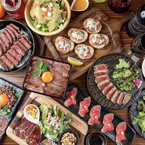美味しい肉料理とお酒で宴会を♪人気No.1はまるで山の様にそびえ立つ「とにかく背高いポテトサラダ~黒毛和牛ローストビーフ巻き~」は勿論、黒毛和牛ステーキ・前菜・サラダ・揚げ物・ローストビーフ盛り合わせ・〆の丼まで人気の肉料理が大集結☆