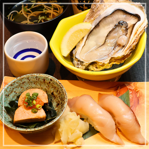 旬の食材を贅沢に詰め込んだ「旬の味覚セット」で季節を味わいませんか?おさかなセンターイチノイチの「ちょい飲みセット」¥1800(お通し代込み)、内容/本日の小鉢、生牡蠣、あん肝酢、寒ブリ握り2貫、ドリンク1杯。