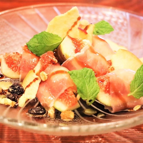 コンポーートした林檎とサワークリーム、それを生ハムで巻いたワインや甘口タイプの日本酒と好相性なサラダです。