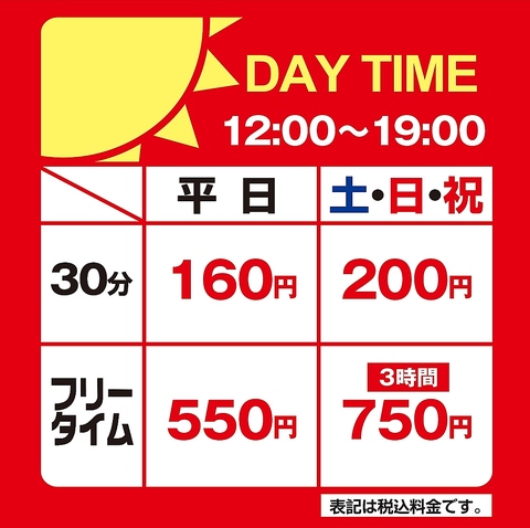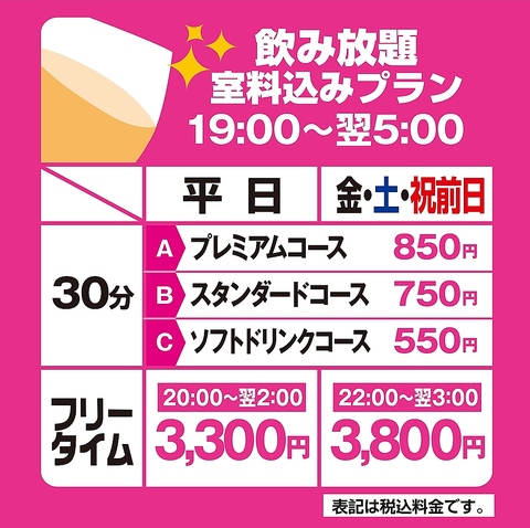 | 飲み放題 | あり :ソフトドリンク30分550円(税込)~、アルコール込30分750円(税込)~! |