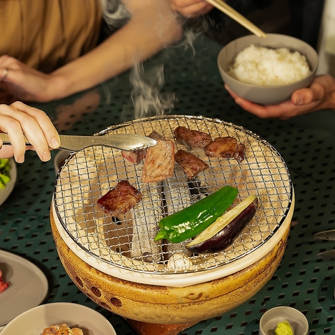 大阪城の景色とともに味わう、特別な焼肉体験。大阪城天守閣を目の前に臨むロケーションで、ゆったりと七輪での海鮮焼きを楽しむエリア。ご自身でお好みの焼き加減に仕上げるスタイルで、新鮮な海鮮や野菜を堪能いただけます。
