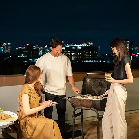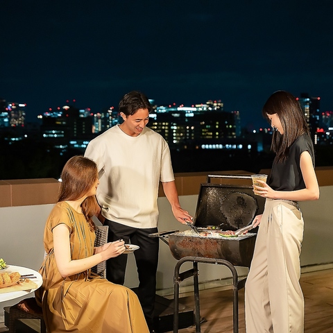 開放感あふれる屋上空間で、BBQコンロを囲みながら過ごすひととき。