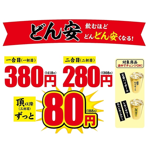 飲めば飲むほど、どんどん安くなる!1杯目:418円(税込)/2杯目:308円(税込)/3杯目以降ずっと:88円(税込)