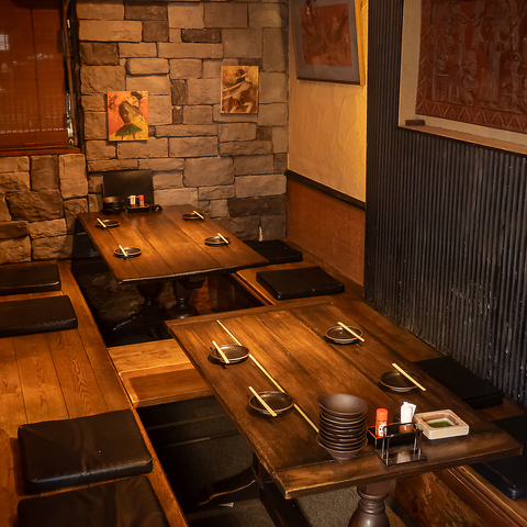 大人気の半個室空間で、くつろぎのひとときを。常連様にも大人気の半個室空間の掘りごたつ席では周りを気にせず会話ができます◎女性やご年配の方、小さなお子様がいるご家庭などにも安心してご利用できる席となっております。木の温かみ溢れる落ち着いた雰囲気で月天自慢の炭火囲炉裏焼き料理やお酒をお楽しみください。