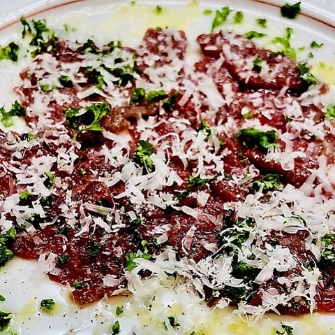 旨みの強い桜肉(馬肉)の豪快なステーキと、10種類以上のハーブと食材で作ったタルタル仕立てソースとのハーモニーは絶品!当店イチオシの大人気メニューです★桜肉は生でも安心して味わえるほど鮮度が抜群なので、臭みがなく食べやすい肉料理となっております。カリカリのメルバトーストにのせてお召し上がりください!