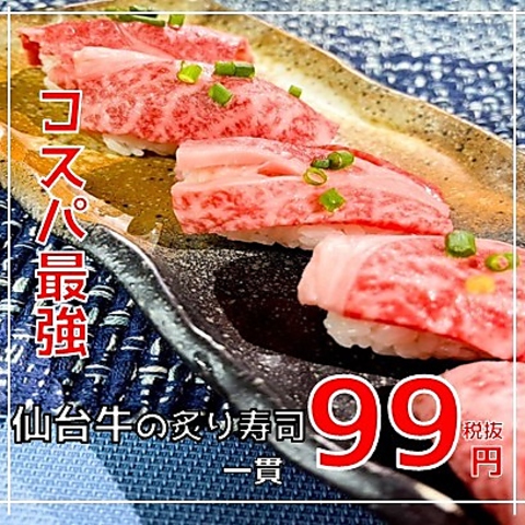 鮮度の良い仙台牛の薄切り肉を軽く炙って握りにした一品。なんと税抜99円!!A5ランクのお肉だからこそ味わえる旨味と、甘醤油のタレが楽しめます。 リーズナブルに愉しめるのは、日々圧倒的なコストパフォーマンスを探求している、仙台大衆酒場 福や三ツ星だからこそ!