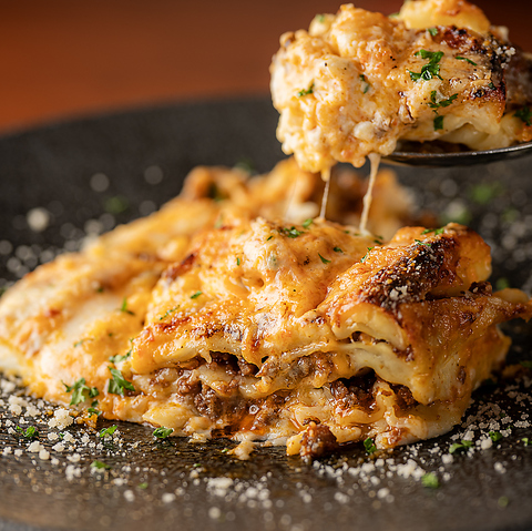 牛肉を香味野菜とともにじっくり煮込み、ソースベシャメル、たっぷりのチーズとともに層にして焼き上げる強烈なうまみのラザニア!