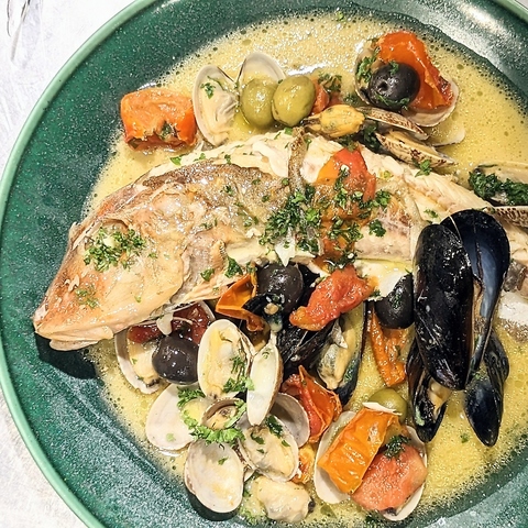 ディナータイム限定! その日のおいしいお魚をシェフが丁寧に下処理し、鉄のフライパンで両面をこんがり。水とあさり、ムール貝を加えじっくりと煮込みます!強烈なうまみを誇る素晴らしいスープを抽出し、たっぷりの具とともにお召し上がりいただく逸品です。
