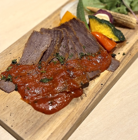 数種のスパイスに一晩漬け込んだ牛の赤身肉の塊をオーブンでじっくり焼き上げました。ハラペーニョトマトソースを合わせてさらにスパイシーに。