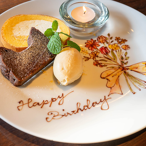 お誕生日や記念日には、メッセージ入りの特製デザートプレートをご用意します。お気軽にご相談ください!