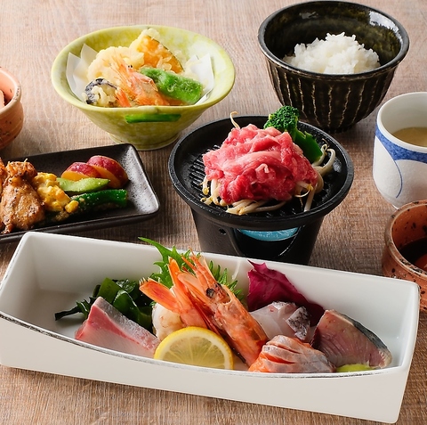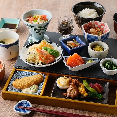 つるべの「おいしい」が詰まった小鉢がいっぱい、人気の彩り御膳!お造り・季節の八寸・自家製豆富・揚げ出し・フライ・天ぷら・茶碗蒸し・日替わり小鉢・サラダうどん・汁物・ご飯(お替り自由)