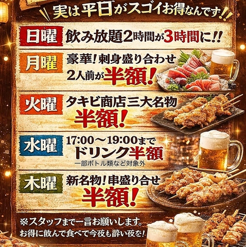 《平日限定!!!》日曜日~木曜日まで日替わりでとってもお得なイベント開催中です!!日曜:2時間飲み放題が3時間に延長♪月曜:刺身盛り合わせが半額◎火曜:三大名物が半額!水曜:17:00~19:00までドリンクが半額(※ボトルは対象外)木曜:串盛り合わせが半額♪店員まで一言お声掛け下さい(^^)♪