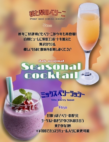 | カクテル | フルーツの赤サングリア/カシスとバレンシアオレンジのテキーラサンライズ/レモンスパークサワー/巨峰スパークサワー |