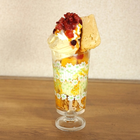 ケーキはすべて熊本県産ミズホチカラの米粉を使った自家製。お店で一つ一つ丁寧に焼き上げています。パフェには自家製ケーキを使い、ボリュームたっぷり。レトロかわいいアデリアのパフェグラスでご提供いたします。