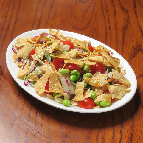 シャキシャキした新鮮なレタス、細切りの根菜とトマトと共にパリパリのトルティーヤチップスを細かく砕いてたっぷり振りかけた食感と彩りが楽しいサラダです。ドレッシングは和風ドレッシングでどなたでも食べやすく、お酒のおつまみにもなる一品です。