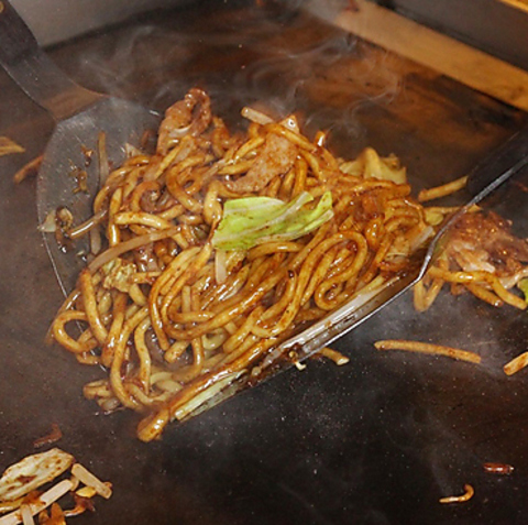 桜えびの風味が堪らない自家製の黒ソース。中太の麺とよく絡まって濃厚な味が堪能できます。その美味しさはメディアでも取り上げられるほど!フォトジェニック的な鉄板おつまみは、味も見た目以上でどれを食べても舌鼓♪