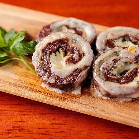 牛肉のスライスでモッツァレラチーズを幾重にも巻き込んだ、贅沢な自家製ソーセージ。 溢れ出すチーズのコクに、爽やかな大葉のアクセントが絶妙にマッチします。 美しい断面が目を引く「輪切り」スタイルでのご提供。もちろん、キリッと冷えたビールとの相性は抜群です!