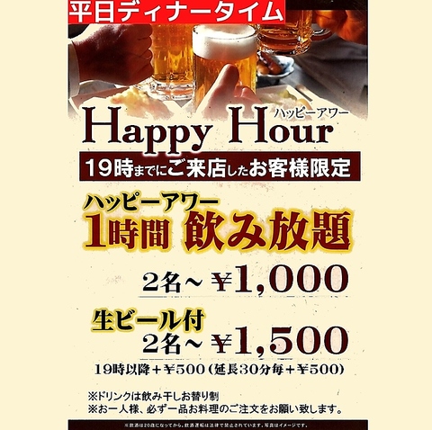 | 利用条件 | 19時までにご入店されたお客様(2名様より)※15分前ラストオーダー、飲み干しお替わり制、お一人様必ず1品のお料理の注文をお願いいたします。 |