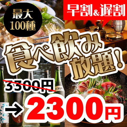 よりお得に宴会を愉しみたい方必見!ピーク帯の時間を避けることで100種の2時間食べ放題&飲み放題付きコースを通常の3,300→2,300円でお愉しみ頂けるプランをご用意致しました!コース内容は変わらず1000円引きでご利用頂ける為コスパ◎個室が空いている可能性も高まります!