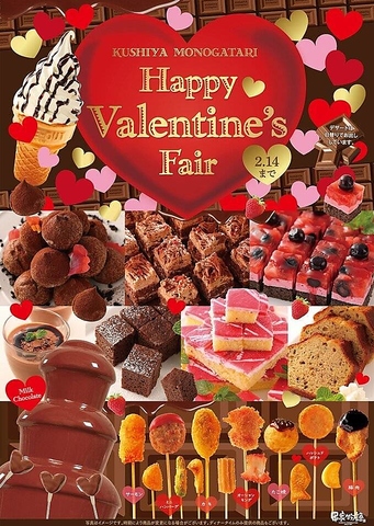 1/15~2/14の期間限定でバレンタインフェアを開催中♪ミニハンバーグ・カキ・ハッシュドポテトなどの串揚げや、日替わりのデザートを多彩にご用意しております。特別なこのフェアをお見逃しなく、素敵な思い出を作りに来てください!皆さまのご来店を心よりお待ちしております。