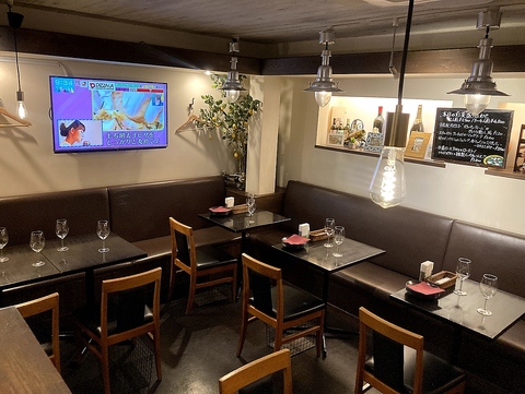 【まったり落ち着いたお席で一杯いかが?】ダークブラウンのソファーと照明の柔らかな光に包まれた地下のテーブル席は、ちょっぴり大人な雰囲気♪大切な人との記念日や誕生日などにおすすめです。ご希望に応じてメッセージプレートもご用意致します。SNS映えバッチリのキュートなハート形ピザもOK!