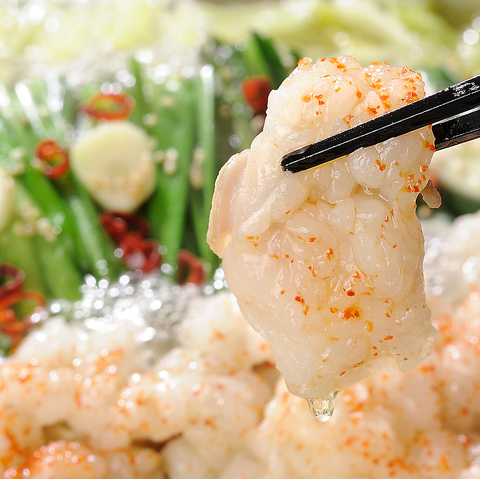 あご出汁の風味、コクがそのまま味わえる極上のもつ鍋。飛魚を100%使用したあご出汁と、最高品質の国産とろホルモンが最高