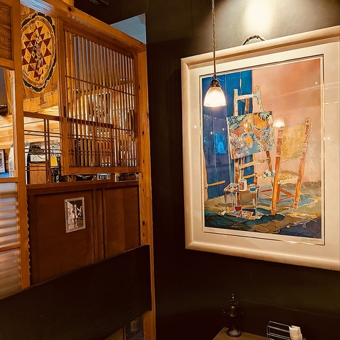間接照明の柔らかな灯りとお洒落な絵画、インテリアに囲まれたフロア。のんびりリラックス出来る隠れ家のような空間です☆デートや女子会、合コンなどにもピッタリ◎ご利用人数によって自在にテーブルレイアウト致します☆