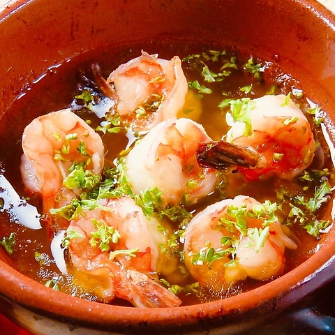 プリッとした海老を、にんにくとオリーブオイルで熱々に仕上げた人気の一品。オイルに染み出した海老の旨味はバゲットに浸して最後の一滴までお楽しみください♪☆ワインとの相性も抜群です。